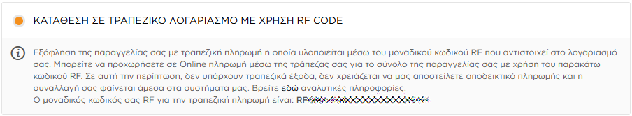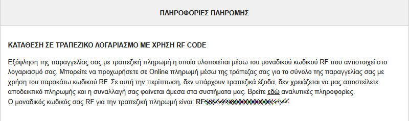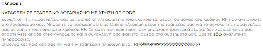 Μπορείτε πλέον να εξοφλήσετε την παραγγελία σας από οποιαδήποτε τράπεζα διαθέτετε λογαριασμό με την χρήση του μοναδικού RF κωδικού σας. Με αυτό τον τρόπο πληρωμής αποφεύγετε τυχόν διατραπεζικά έξοδα, δεν χρειάζεται να μας αποστείλετε αποδεικτικό πληρωμής, δεν χρειάζεται να τοποθετείτε εκ νέου στοιχεία και αιτιολογίες πληρωμής όπως επίσης η συναλλαγή σας φαίνεται άμεσα στα συστήματα μας. Ως εκ τούτου η παραγγελία σας εκτελείται με προτεραιότητα. Σε περίπτωση που αντιμετωπίζετε οποιοδήποτε πρόβλημα στην εύρεση του RF κωδικού σας ή έχετε μόλις εγγραφεί στην ιστοσελίδα μας επικοινωνήστε με το τμήμα πωλήσεων εργάσιμες ώρες και ημέρες για την άμεση εξυπηρέτησή σας.