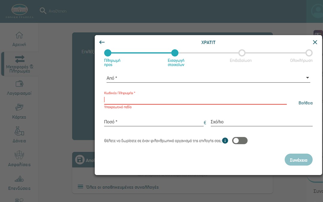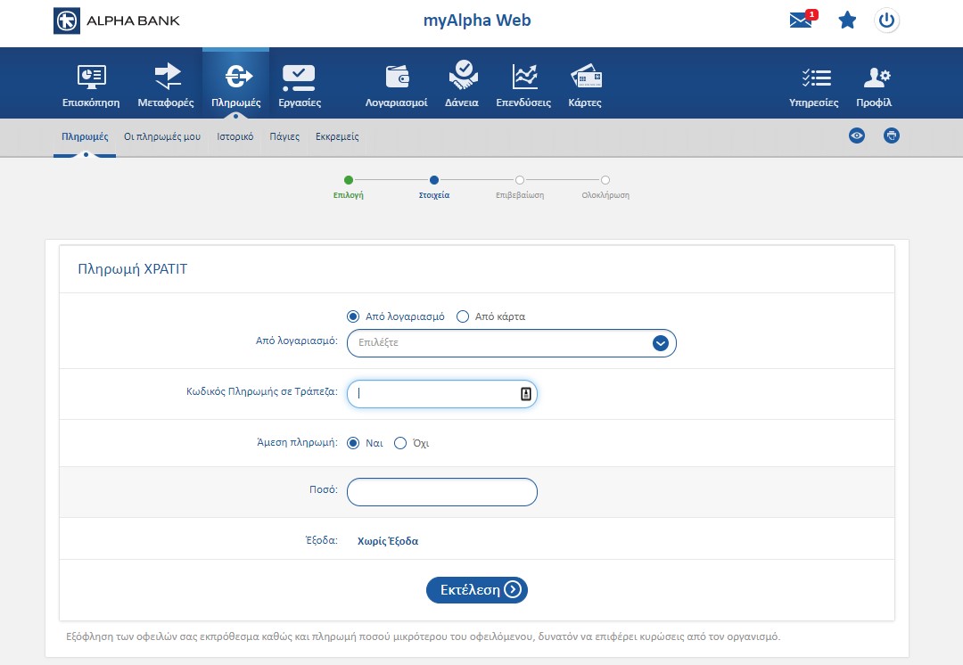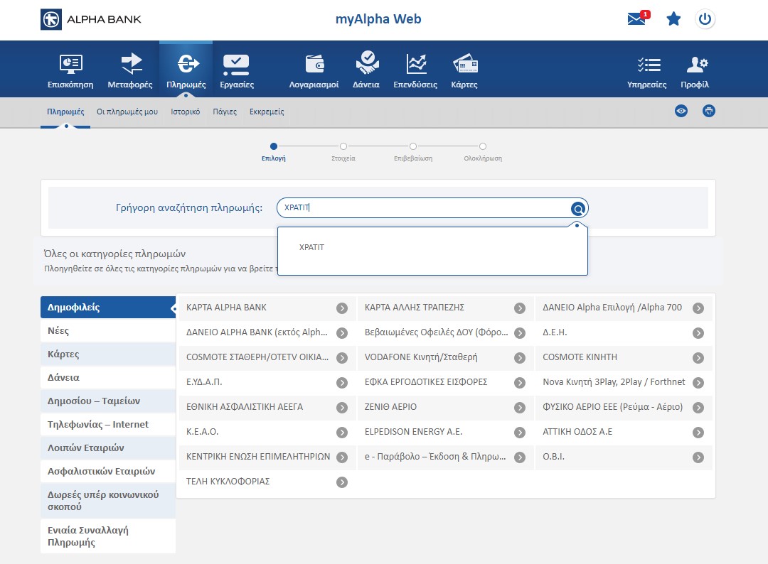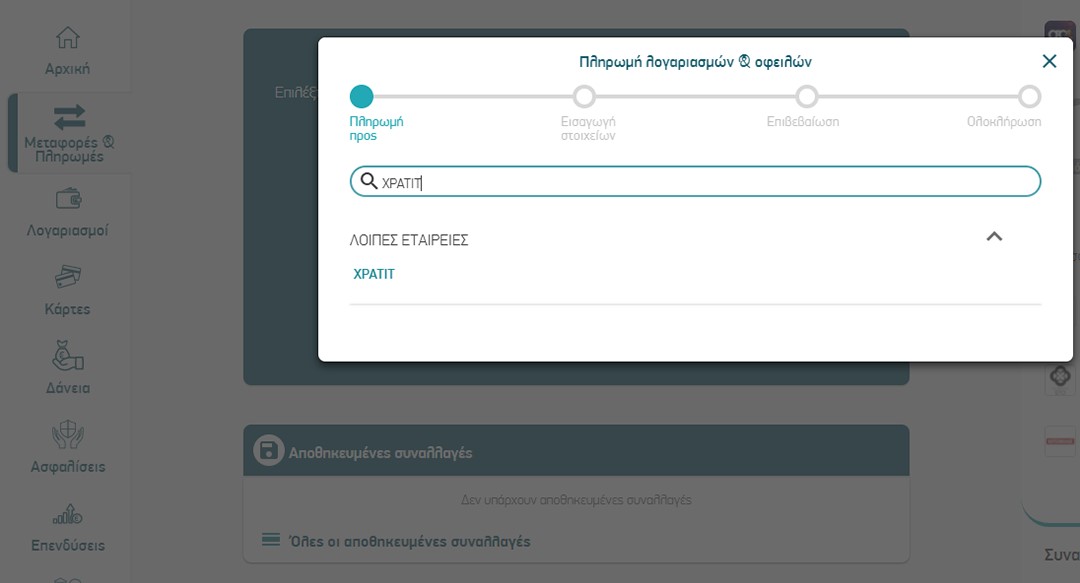 Κάντε login στο e-banking με τα στοιχεία σας και επιλέξτε Πληρωμές και στο πεδίο αναζήτησης που θα εμφανιστεί γράψτε Xpatit.