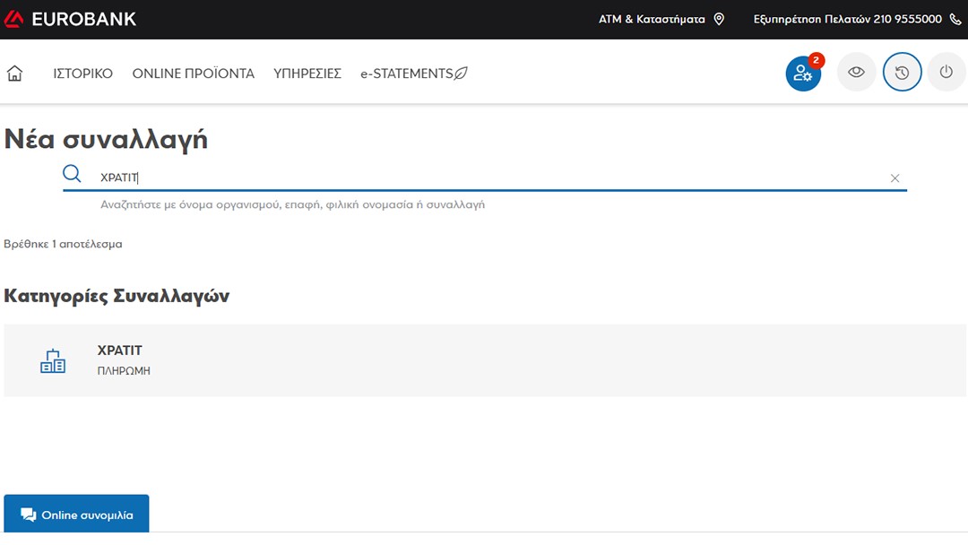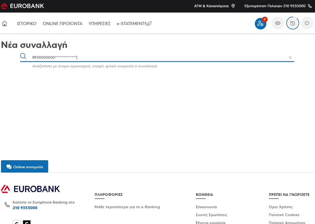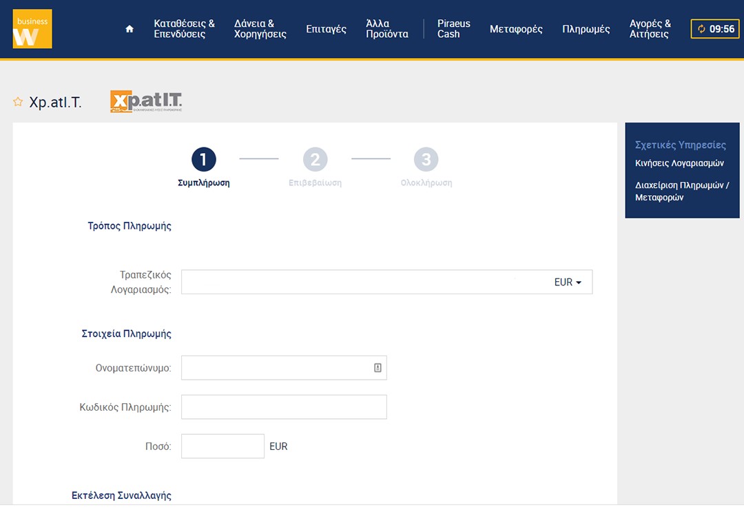 Κάντε login στο e-banking με τα στοιχεία σας και επιλέξτε Νέα Συναλλαγή και στο πεδίο αναζήτησης που θα εμφανιστεί εισάγετε τον rf κωδικό πληρωμής που αντιστοιχεί σε εσάς ή την επιχείρησή σας, είτε πληκτρολογήστε Xpatit για να εμφανιστεί η εταιρεία μας και εν συνεχεία κάνετε κλικ στο κουμπί ΠΛΗΡΩΜΗ.