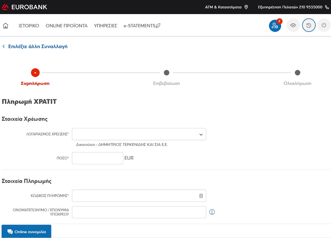 Κάντε login στο e-banking με τα στοιχεία σας και επιλέξτε Μεταφορές και Πληρωμές > Πληρωμή λογαριασμών και οφειλών. Στο πεδίο αναζήτησης που θα εμφανιστεί γράψτε Xpatit.
