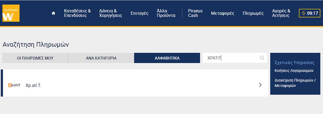 Κάντε login στο e-banking με τα στοιχεία σας και από το βασικό οριζόντιο μενού επιλέξτε Πληρωμές > Ανά κατηγορία (ή αλφαβητικά) και στο πεδίο αναζήτησης γράψτε Xpatit.